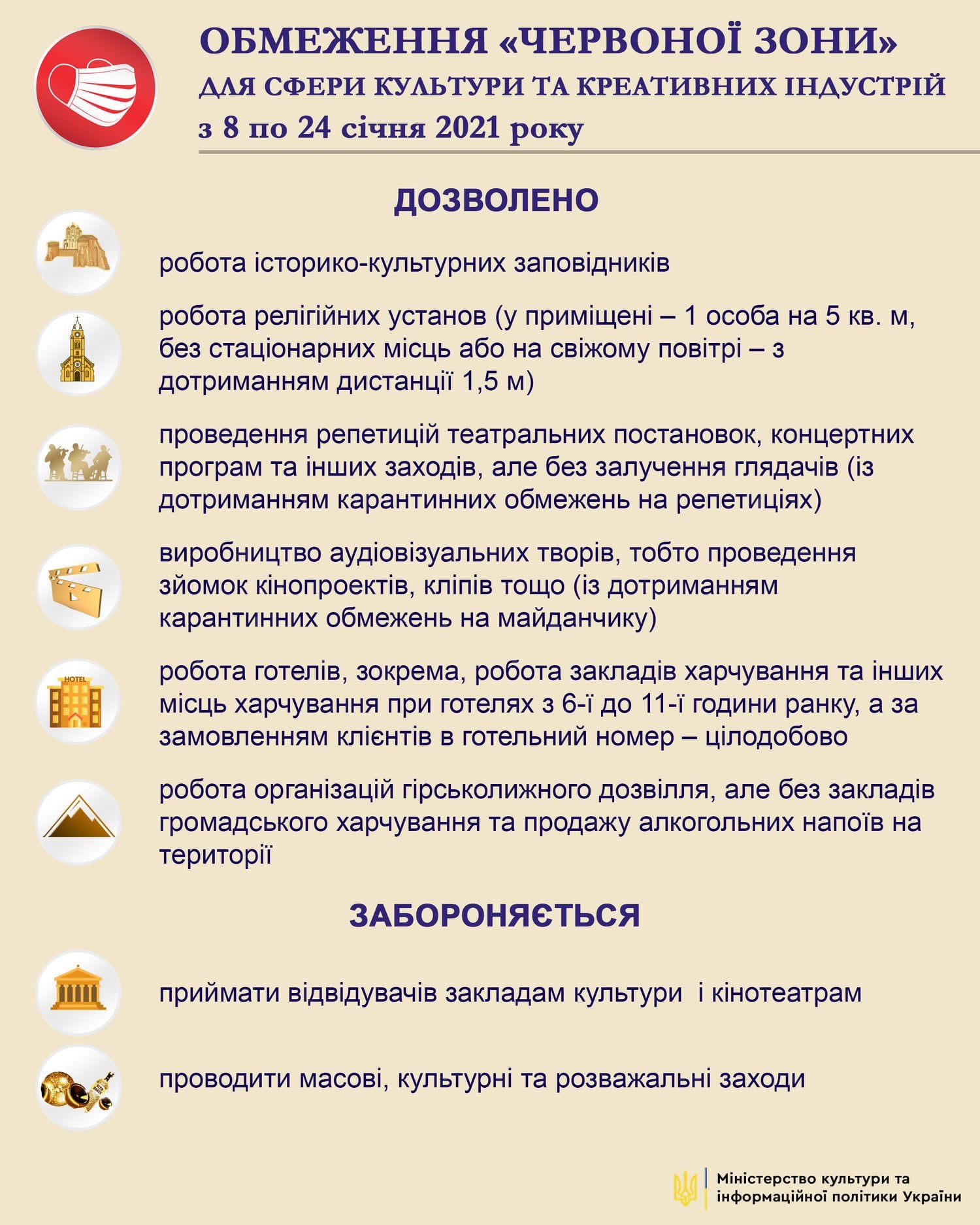 Під час локдауну в Україні, що діятиме від 8 до 24 січня, забороняється приймання відвідувачів закладами культури і кінотеатрам та проведення культурних масових і розважальних заходів. Водночас, є низка дозволів.