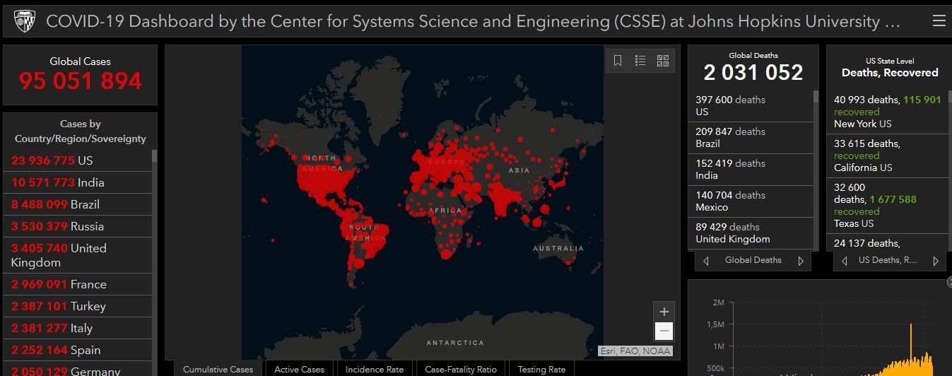 Согласно сайту, где публикуется обновленная статистика, утром 18 января в мире было зафиксировано: 95 042 229 случаев заражения COVID-19 и 2 030 805 смертей от коронавируса.