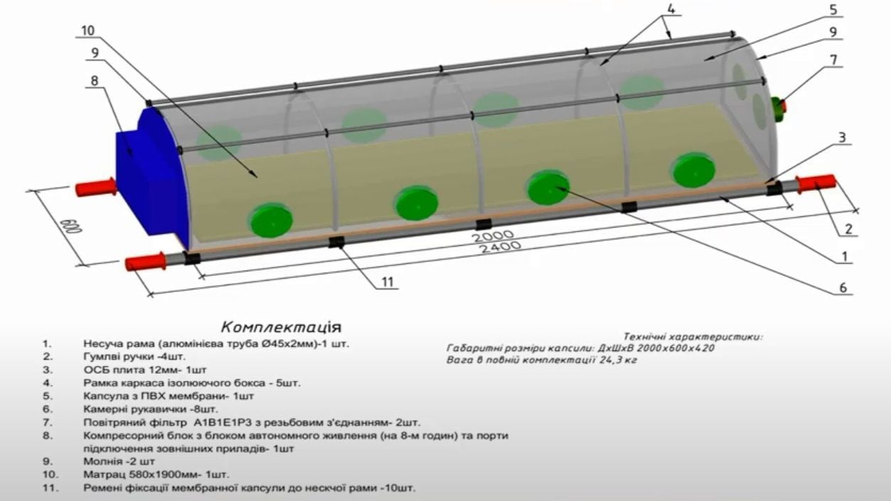 Капсула оснащена кислородной маской, портативным реанимационным набором, компрессором на аккумуляторах (работают 8 часов), который подает кислород в капсулу, специальными перчатками, которые можно снять, чтобы дезинфицировать капсулу изнутри.