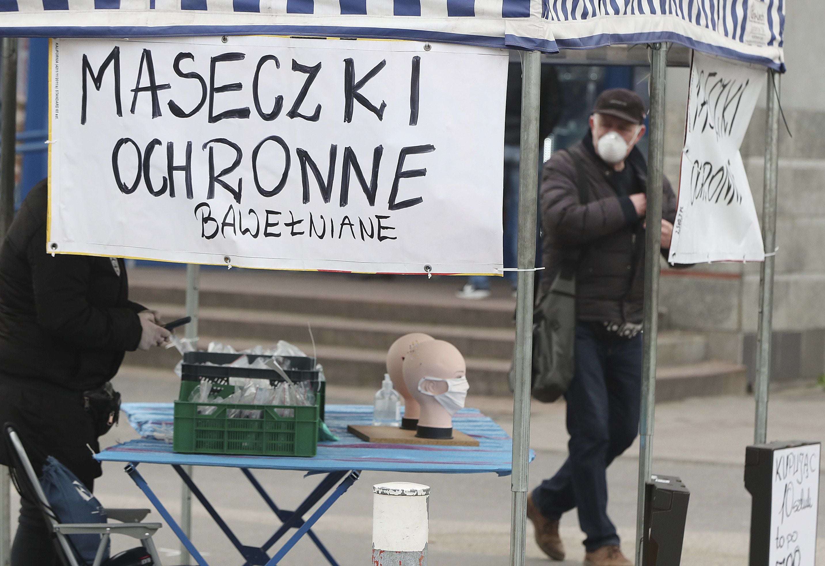 Борясь с нехваткой защитных масок от распространения коронавирус, частная фирма продает хлопковые маски на улице в Варшаве.